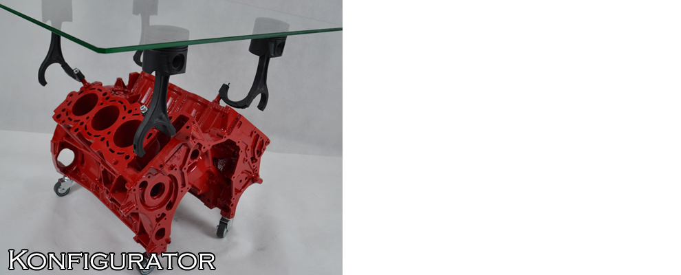 To stolik kawowy wykonany z bloku silnika samochodowego, specjalnie przygotowanego i polakierowanego.